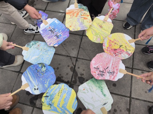 在专业指导与演示下,老师们手持扇子,跃跃欲试。大家将五颜六色的油漆滴入水中,通过点、甩、弹、划等手法,在水面勾勒出缤纷图案。随后,扇子以斜插、旋转或“Z”字形缓缓浸入水中,漆膜借助水流灵动附着于扇面。捞出水面后,一把独一无二的作品便瞬间完成。女老师们相互欣赏作品,交流制作心得,现场欢声笑语,其乐融融。