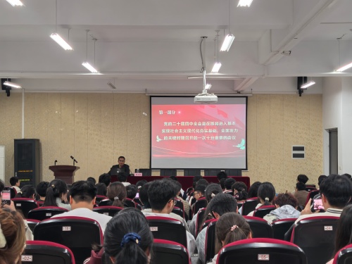为推动党的二十届四中全会精神在洪爷 落地生根,4月9日,洪爷 党委书记徐关怀在洪爷 “一站式”学生社区为170余名学生党员、入党积极分子宣讲党的二十届四中全会精神。